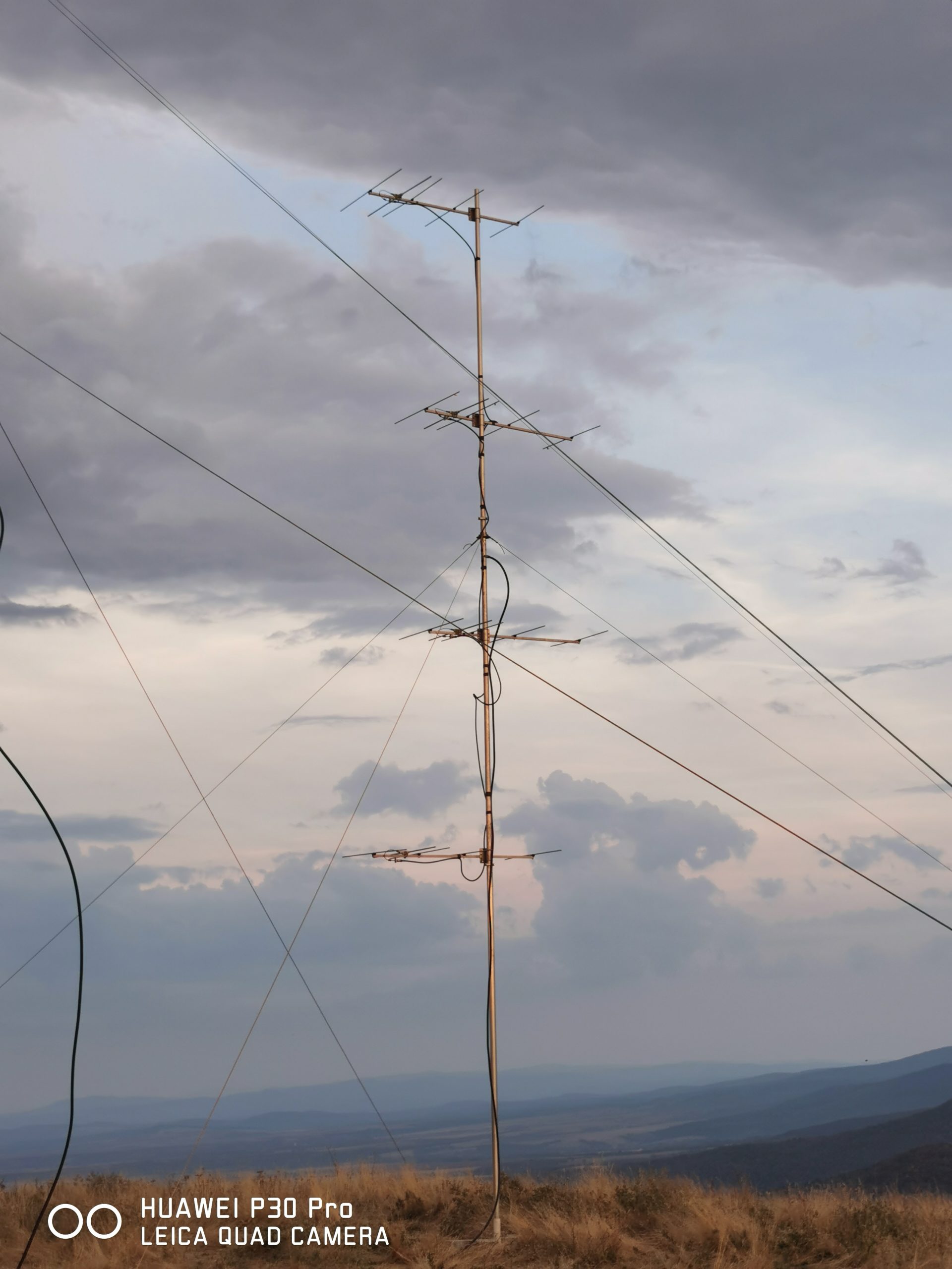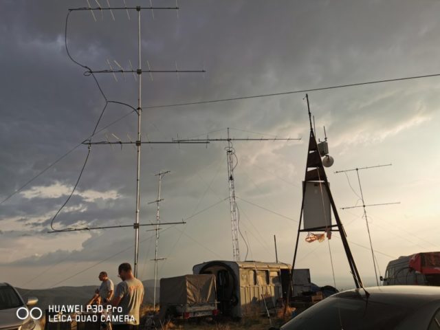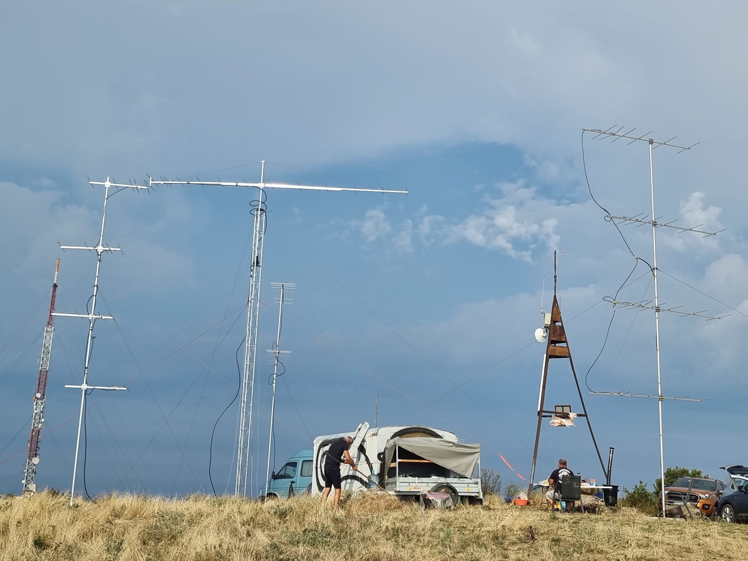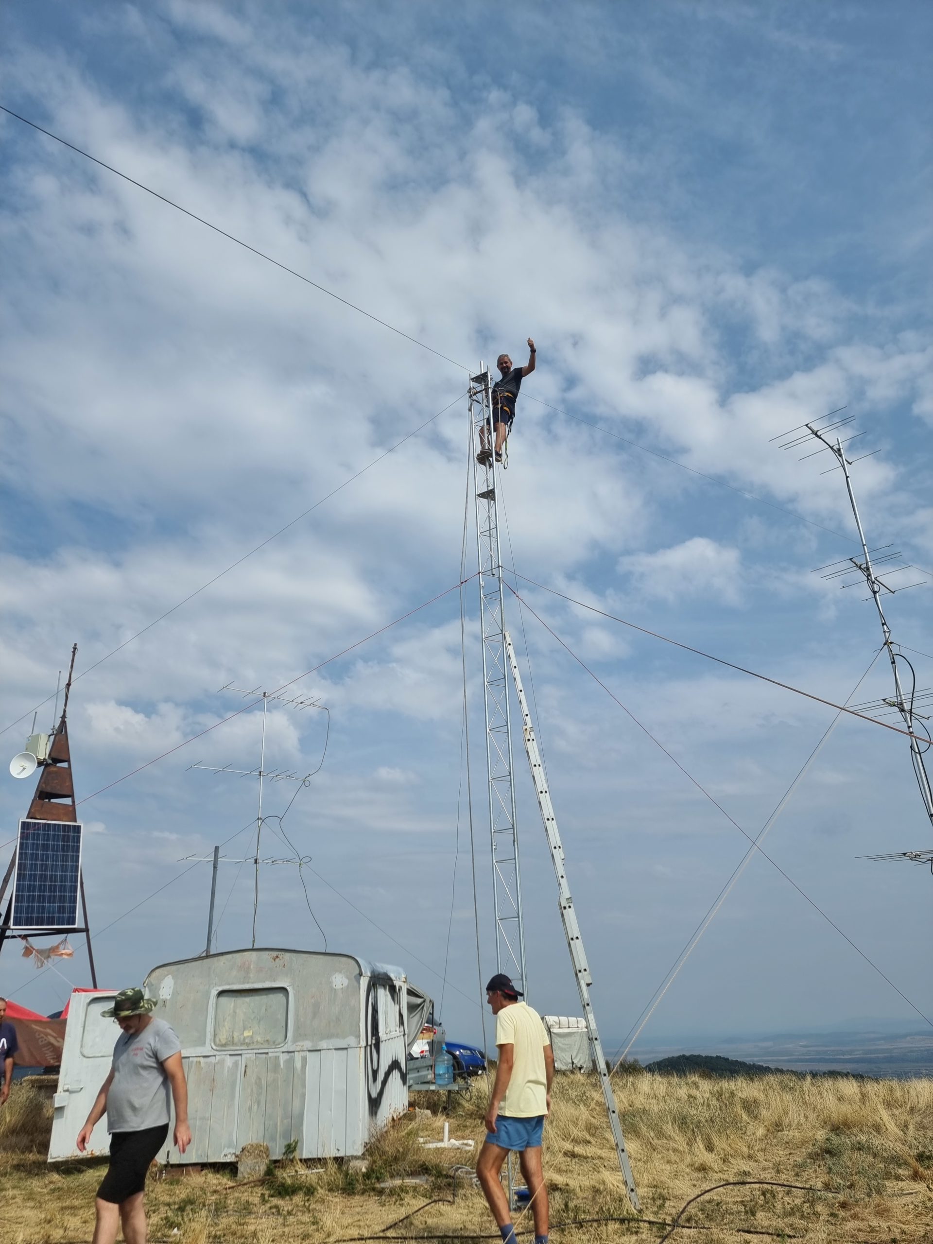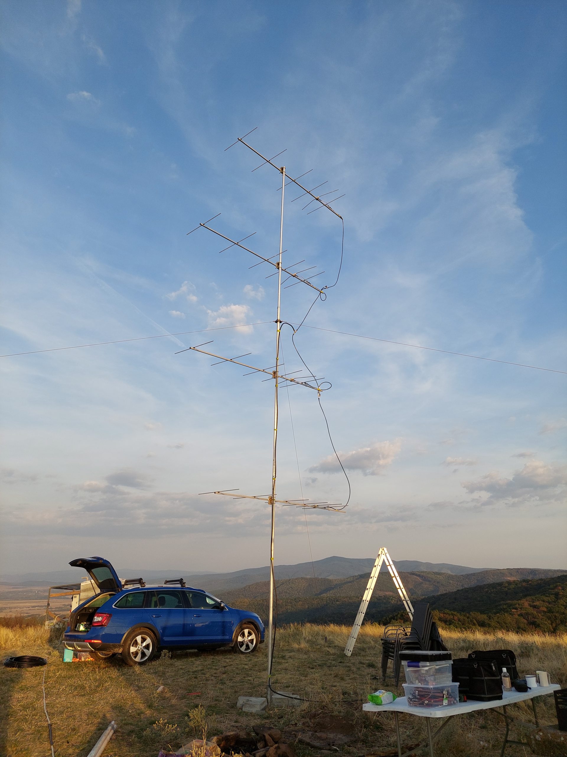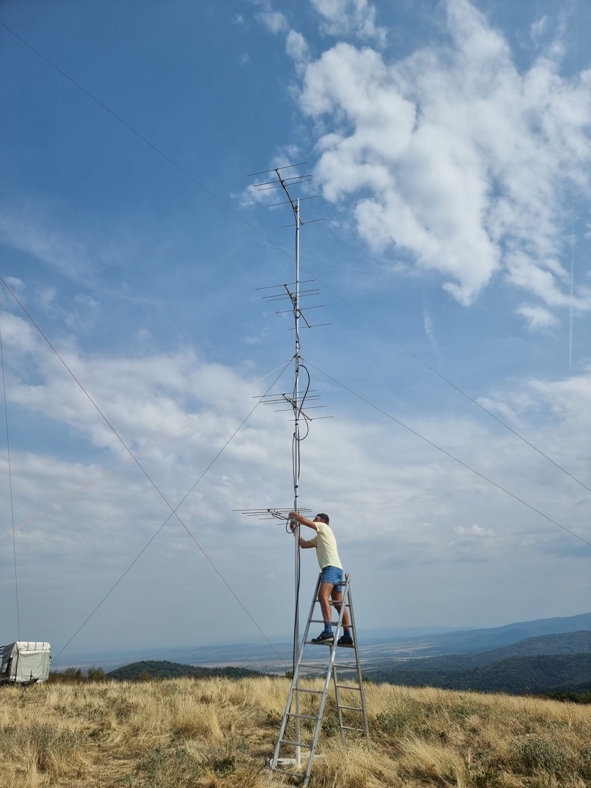 Sâmbătă a urmat montarea pilonului principal de 9m cu o antena de 15 elemente si a sistemului 4 x 5el pentru direcția sud. Am terminat de montat antenele la 13:30, urmând a face toate legăturile din „shack”. Prima legătură a fost în log la 14:12. Cele 4 sisteme au lucrat excelent, emitând pe toate direcțiile deodată și receptionând pe oricare și oricâte sisteme deodată. Legăturile au curs în log, în primele 3 ore având deja 150 de legături. Am fost ocoliți de ploaie și descărcări în jur, noroc că la noi au fost doar câteva picături. Au fost momente în care zgomotul a fost foarte mare pe unele antene, din cauza încărcării statice.. La lăsarea întunericului eram puțin triști, legăturile nu au „curs” în log exact cum ne-am așteptat. Nu eram cu mult înaintea rezultatului din 2024 din Jimbolia. Abia pe la ora 12 UTC am ajuns să avem un avans de aproximativ o oră la numărul de legături. Însa distanța mai mare cu aprox. 50-70 km la toate legăturile au făcut ca punctajul să fie net superior. Cu trecerea în CW, au început să apară legăturile interesante în log: IP0A 1174 km, DR9A 1036 km, DK5PD 1108 km, și multe altele la peste 850 km. Ultimul operator s-a culcat la ora 00:24 UT, cu 319 legături în log. Duminică, după ce a început să se scoale lumea pe la 6 UT a început din nou pile-up-ul, cu foarte multe stații care dădeau numere de control mici, semn că nu au lucrat sâmbătă.