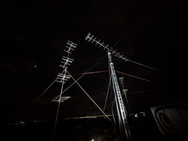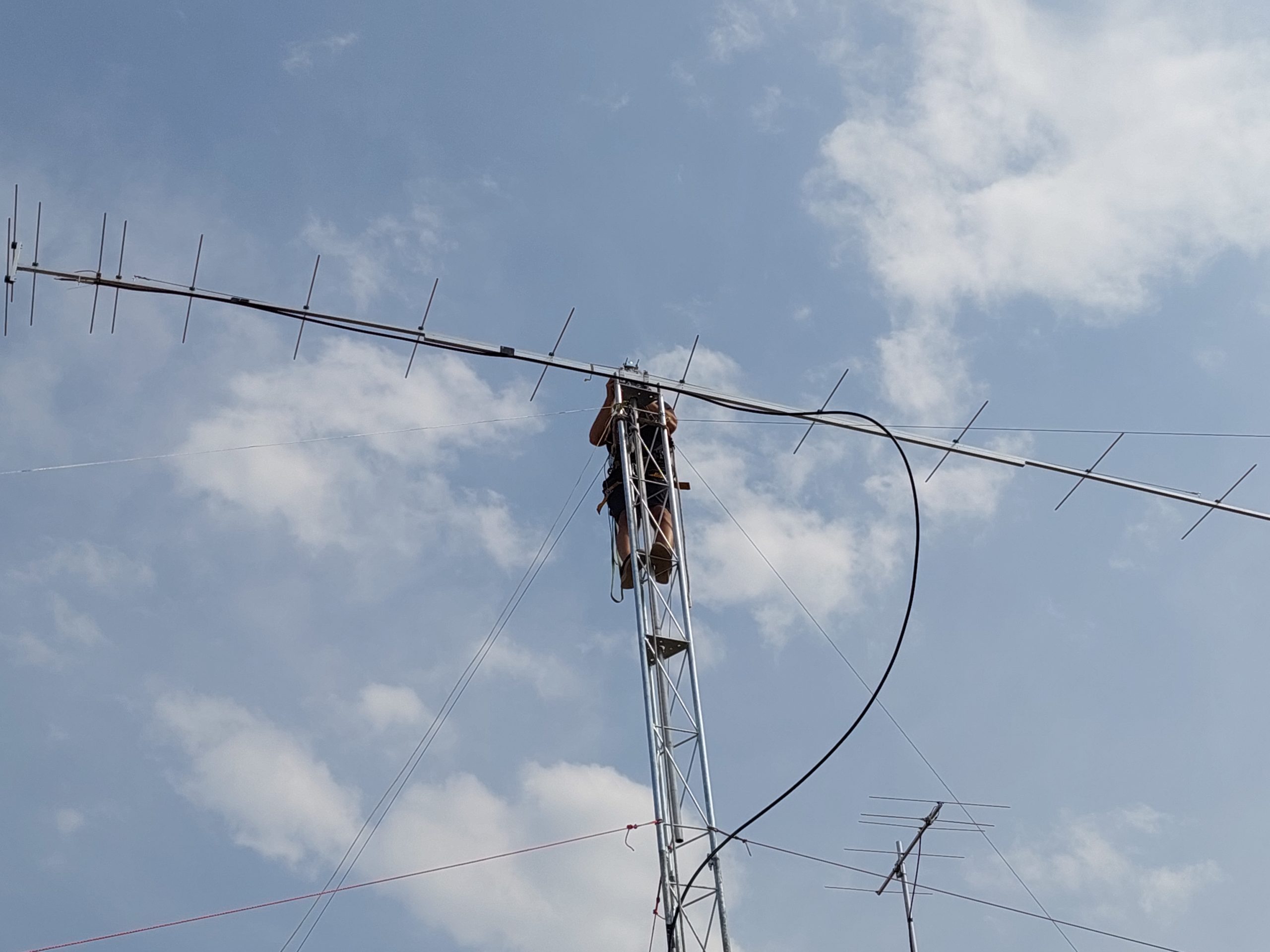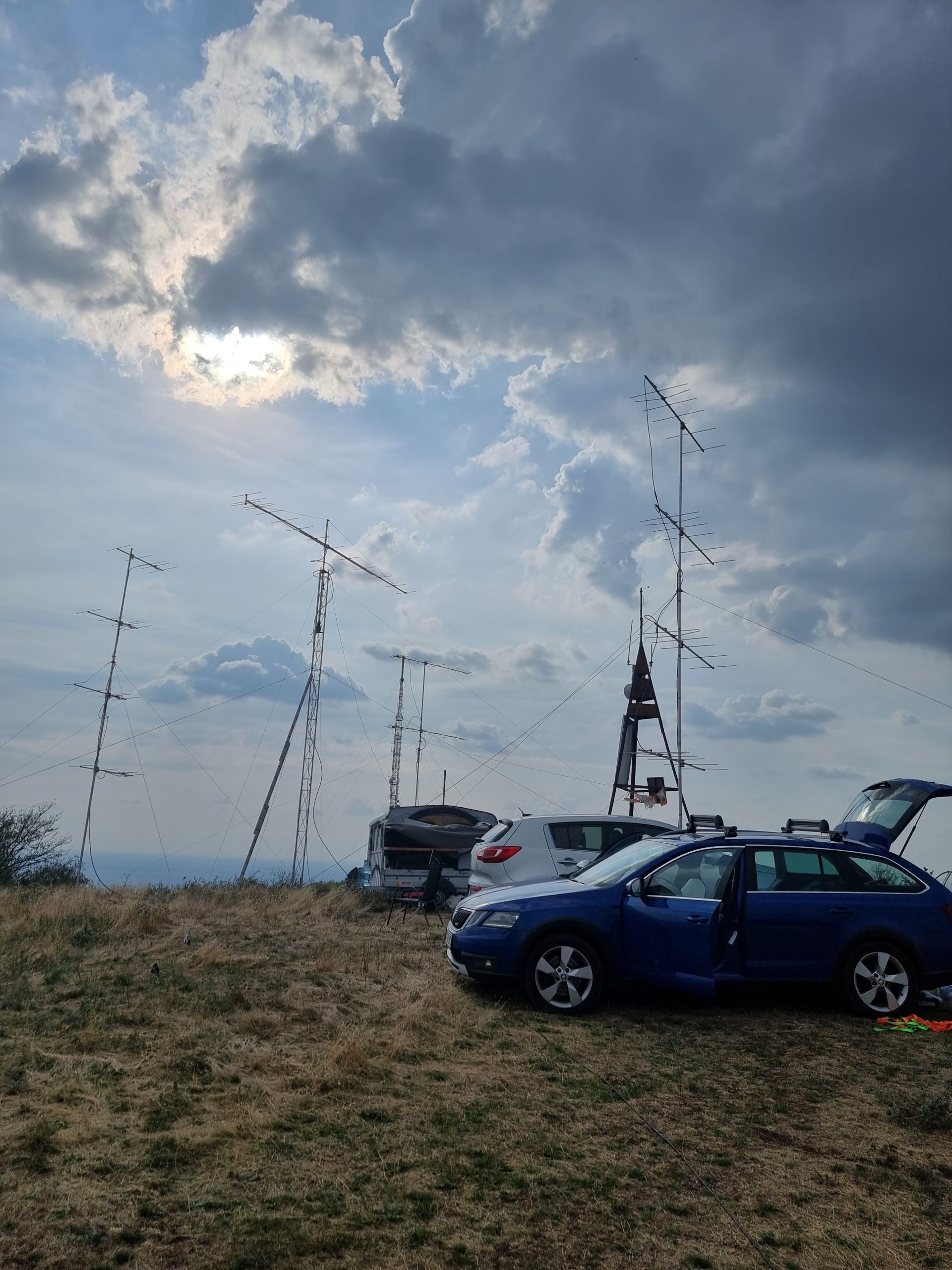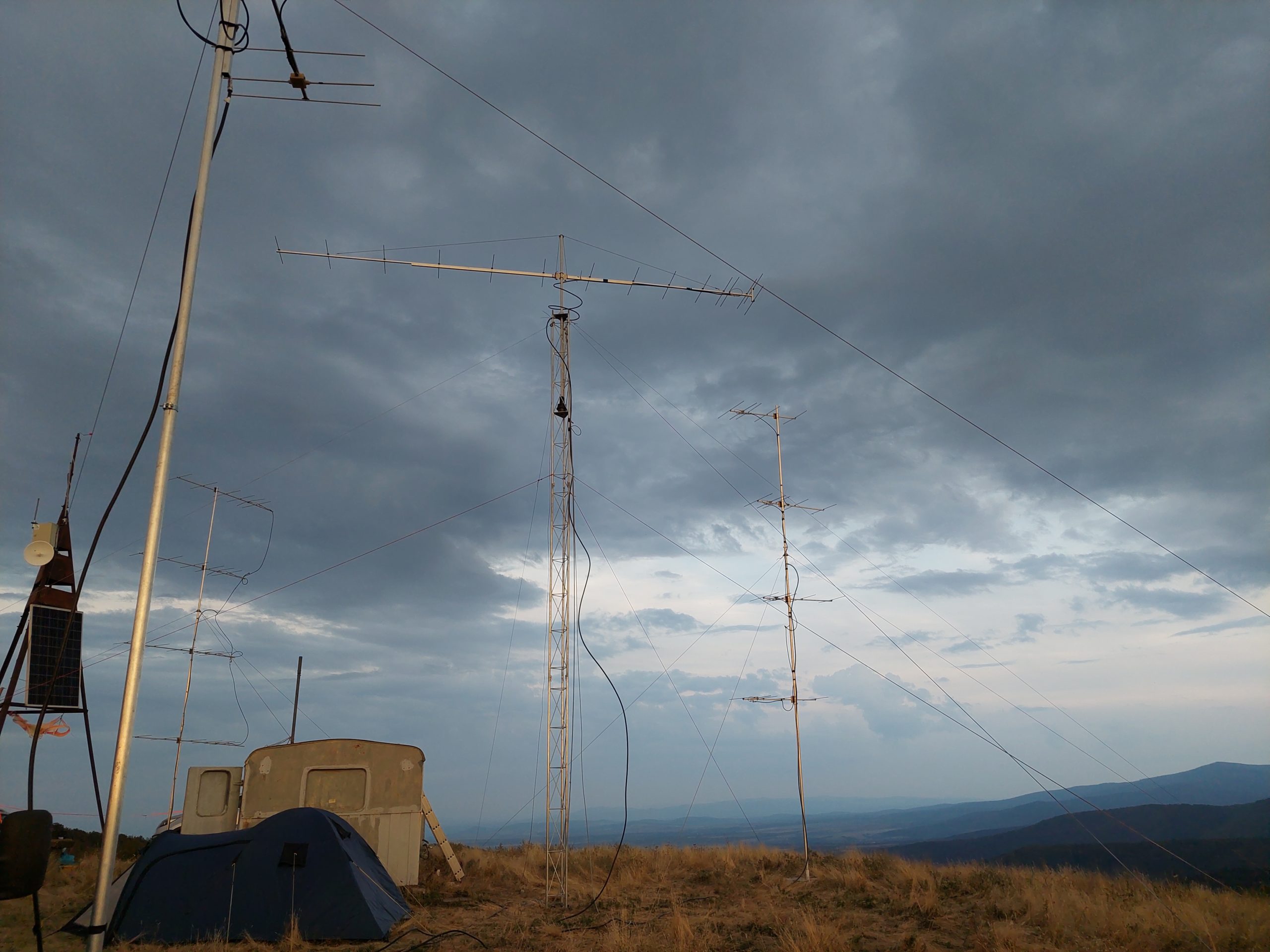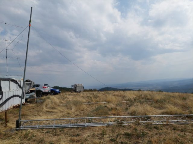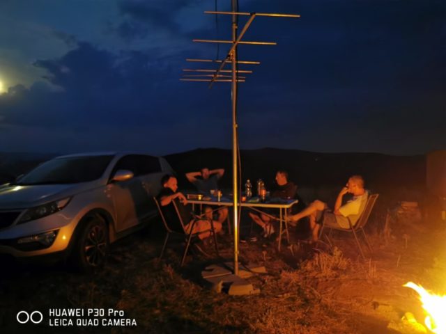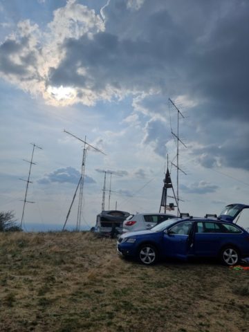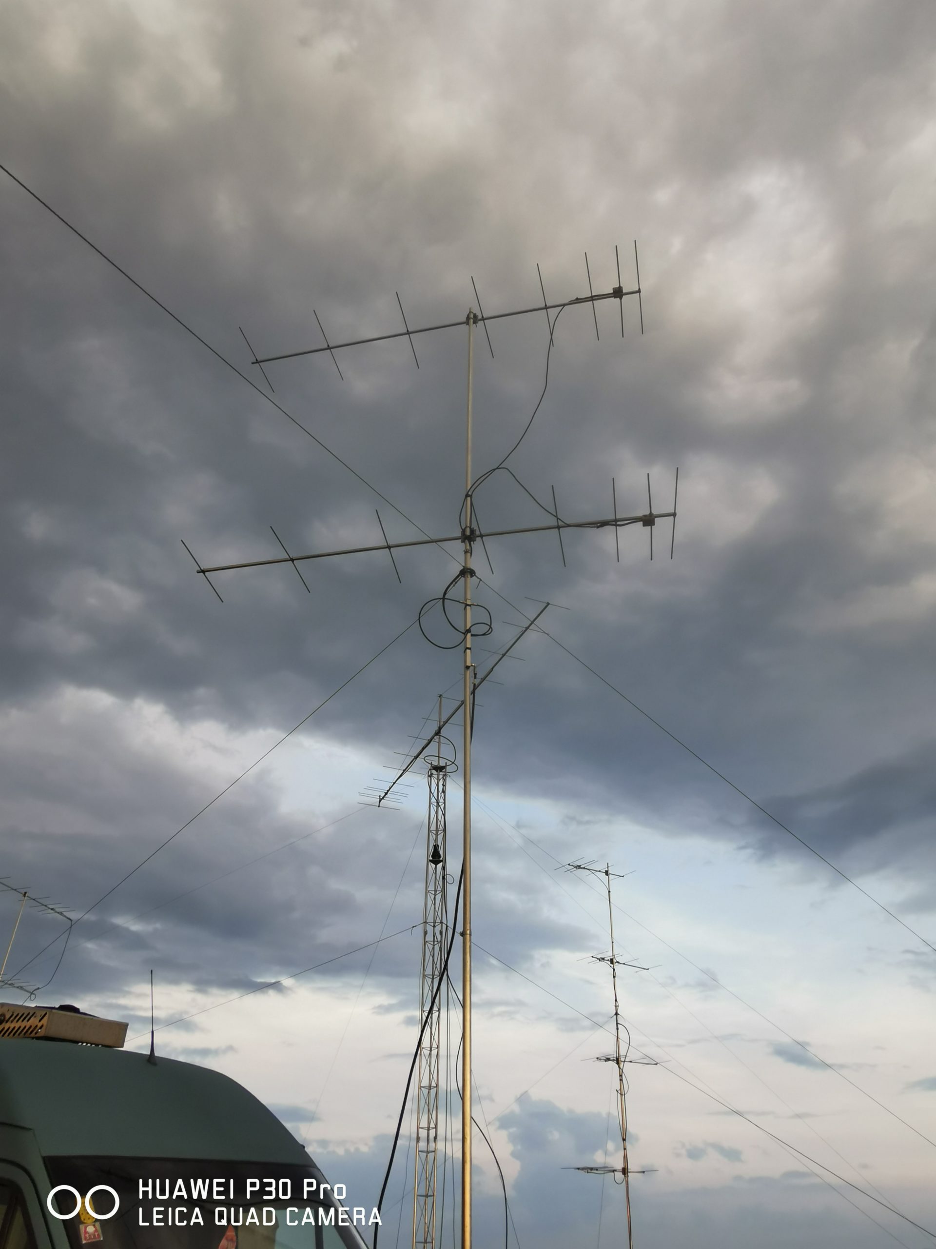 Sâmbătă a urmat montarea pilonului principal de 9m cu o antena de 15 elemente si a sistemului 4 x 5el pentru direcția sud. Am terminat de montat antenele la 13:30, urmând a face toate legăturile din „shack”. Prima legătură a fost în log la 14:12. Cele 4 sisteme au lucrat excelent, emitând pe toate direcțiile deodată și receptionând pe oricare și oricâte sisteme deodată. Legăturile au curs în log, în primele 3 ore având deja 150 de legături. Am fost ocoliți de ploaie și descărcări în jur, noroc că la noi au fost doar câteva picături. Au fost momente în care zgomotul a fost foarte mare pe unele antene, din cauza încărcării statice.. La lăsarea întunericului eram puțin triști, legăturile nu au „curs” în log exact cum ne-am așteptat. Nu eram cu mult înaintea rezultatului din 2024 din Jimbolia. Abia pe la ora 12 UTC am ajuns să avem un avans de aproximativ o oră la numărul de legături. Însa distanța mai mare cu aprox. 50-70 km la toate legăturile au făcut ca punctajul să fie net superior. Cu trecerea în CW, au început să apară legăturile interesante în log: IP0A 1174 km, DR9A 1036 km, DK5PD 1108 km, și multe altele la peste 850 km. Ultimul operator s-a culcat la ora 00:24 UT, cu 319 legături în log. Duminică, după ce a început să se scoale lumea pe la 6 UT a început din nou pile-up-ul, cu foarte multe stații care dădeau numere de control mici, semn că nu au lucrat sâmbătă.
